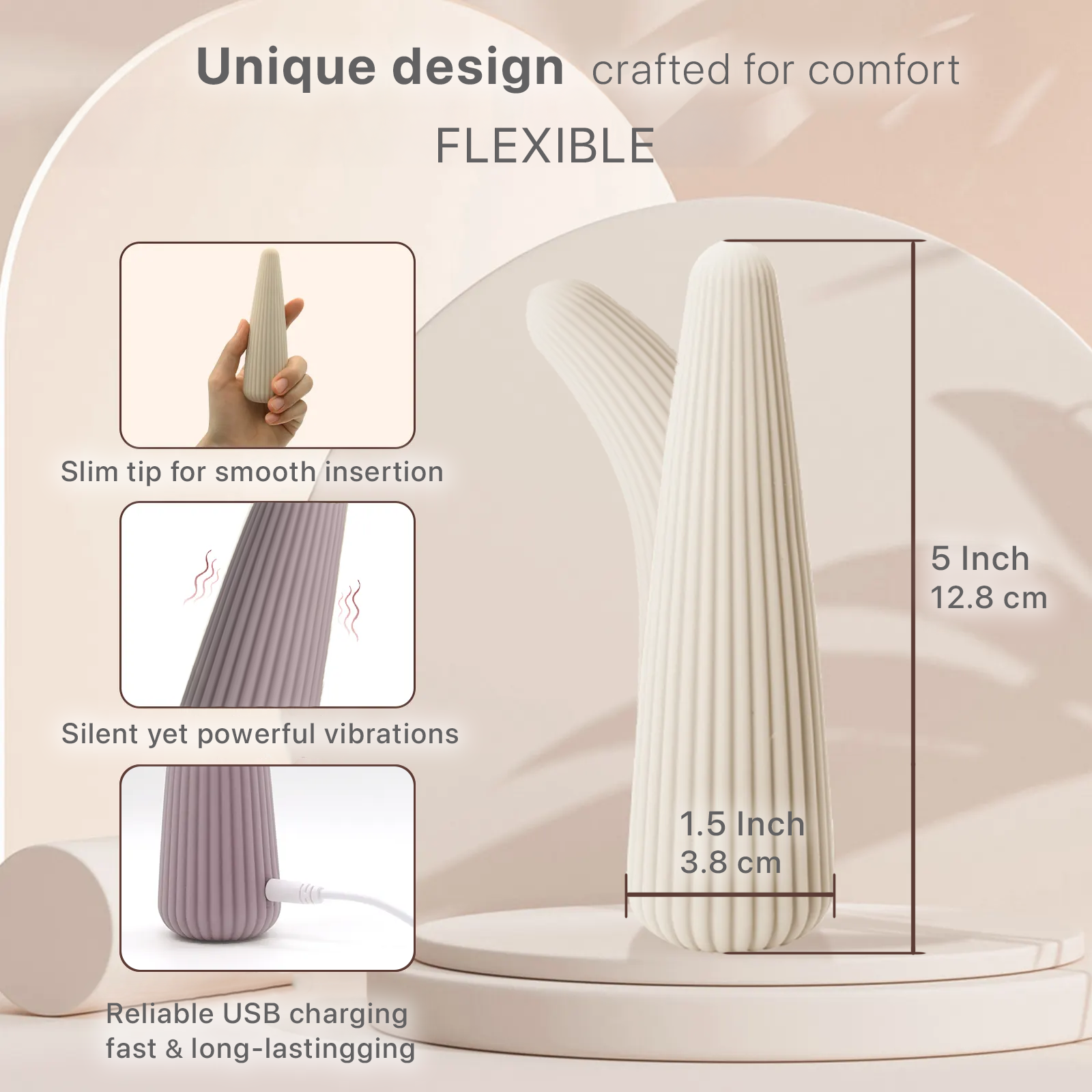 A sleek, modern vibe crafted for precision and comfort. The micro-ribbed, flexible conical tip glides effortlessly, delivering focused stimulation exactly where you want it—clitoris, G-spot, nipples, perineum, or external anal play.* Made with body-safe, velvety silicone in refined pastel tones, this elegant essential pairs quiet power with intuitive controls for a seamless experience solo or with a partner.